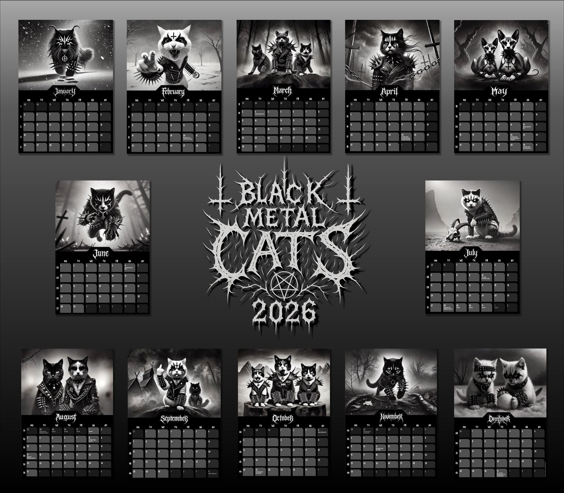 🤘Black Metal Cat Calendar 2026 - Celebrate the duality of cute and kvlt!