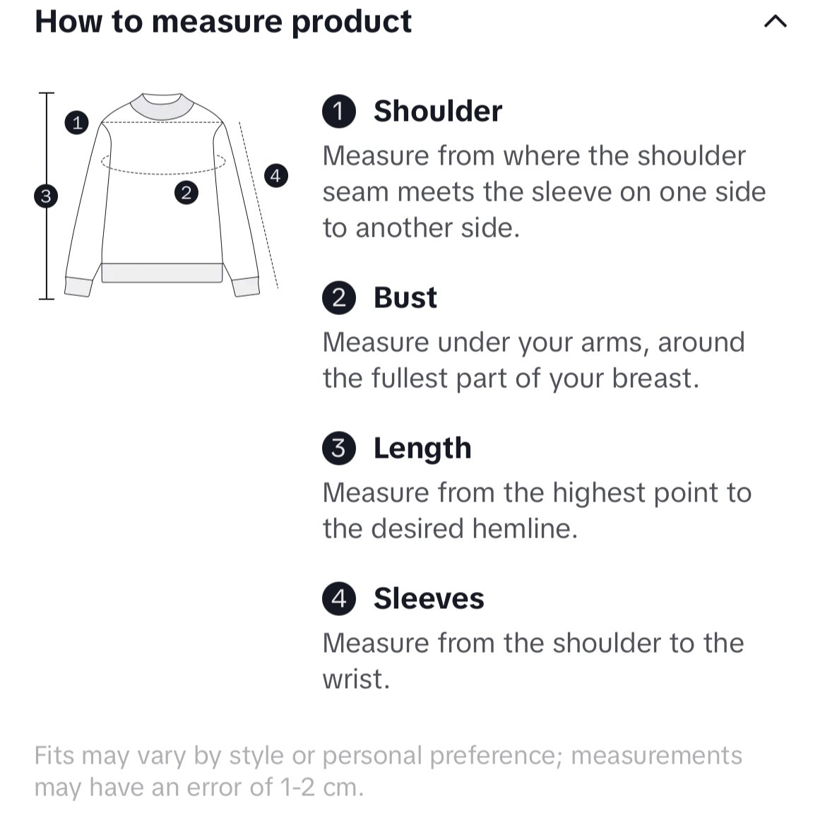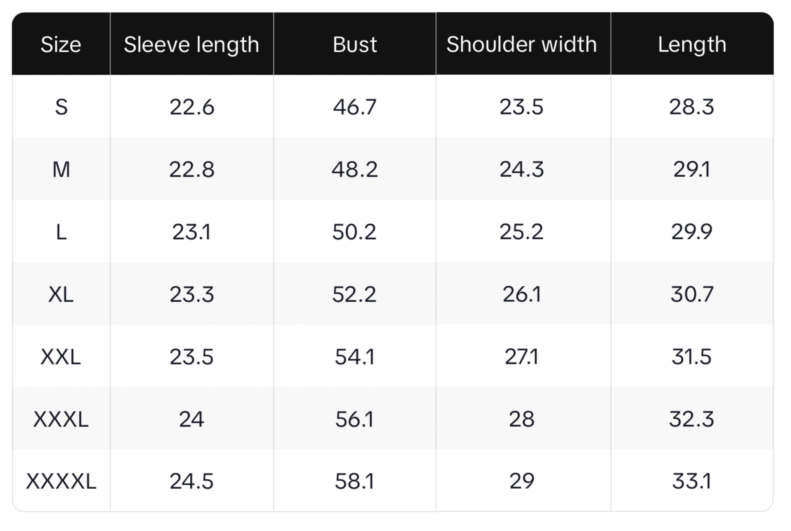Size chart in inches