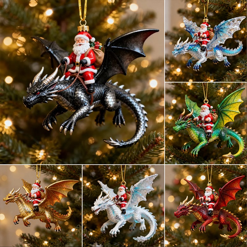 Each ornament features Santa Claus riding a beautifully sculpted dragon, transforming your holiday décor into an adventure-filled wonderland.